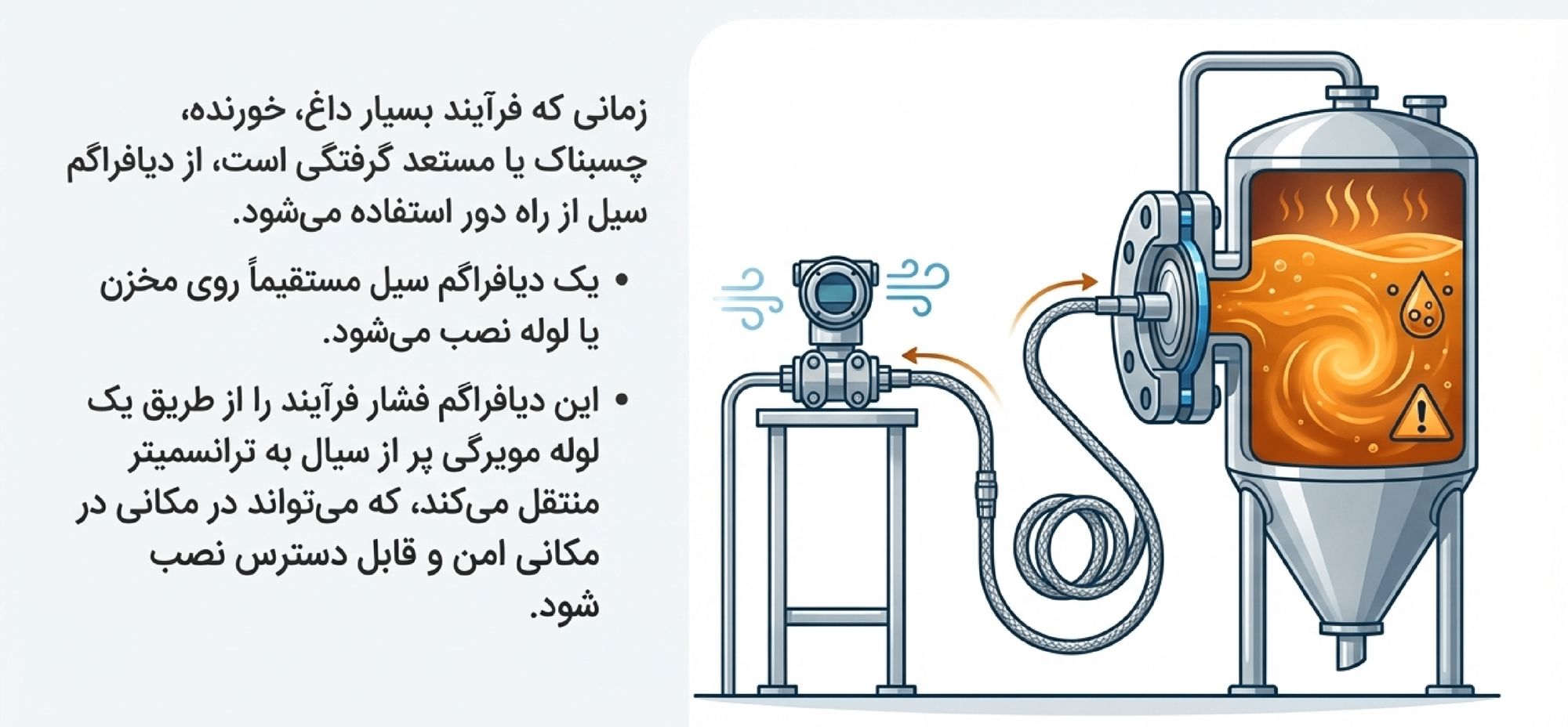 در شرایطی که تماس مستقیم ترانسمیتر با سیال فرآیندی امکانپذیر یا ایمن نیست، از سیستمهای آببند جداکننده یا سیل از راه دور (Remote Seal) استفاده میشود. در این ساختار، یک دیافراگم جداکننده سیال فرآیندی را از تجهیز اندازهگیری ایزوله میکند و فشار از طریق یک سیال پرکننده مناسب به سلول اندازهگیری منتقل میشود. این روش برای سیالات بسیار داغ، چسبنده، کریستالیزهشونده، ساینده یا سمی کاربرد گستردهای دارد. همچنین، در اندازهگیری سطح مخازن، بهویژه مخازن تحت فشار یا مخازنی که دسترسی مستقیم به آنها دشوار است، استفاده از Remote Seal بسیار رایج است.