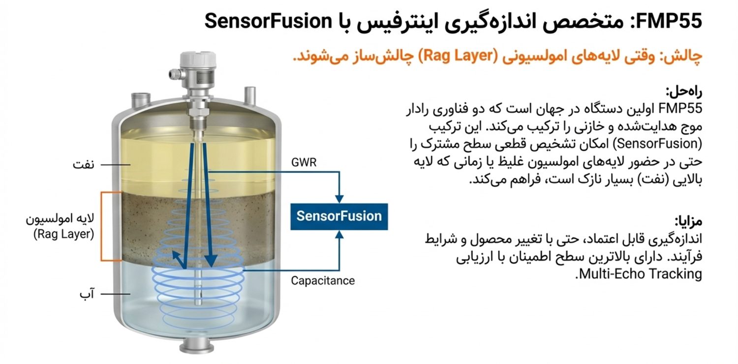 Levelflex FMP55: نوآورانهترین دستگاه برای اندازهگیری سطح مشترک است که از فناوری SensorFusion (ترکیب رادار هدایتشده و اندازهگیری خازنی) بهره میبرد . این مدل حتی در لایههای امولسیونی غلیظ که مرز بین دو مایع شفاف مشخص نیست، اندازهگیری دقیقی ارائه میدهد [.