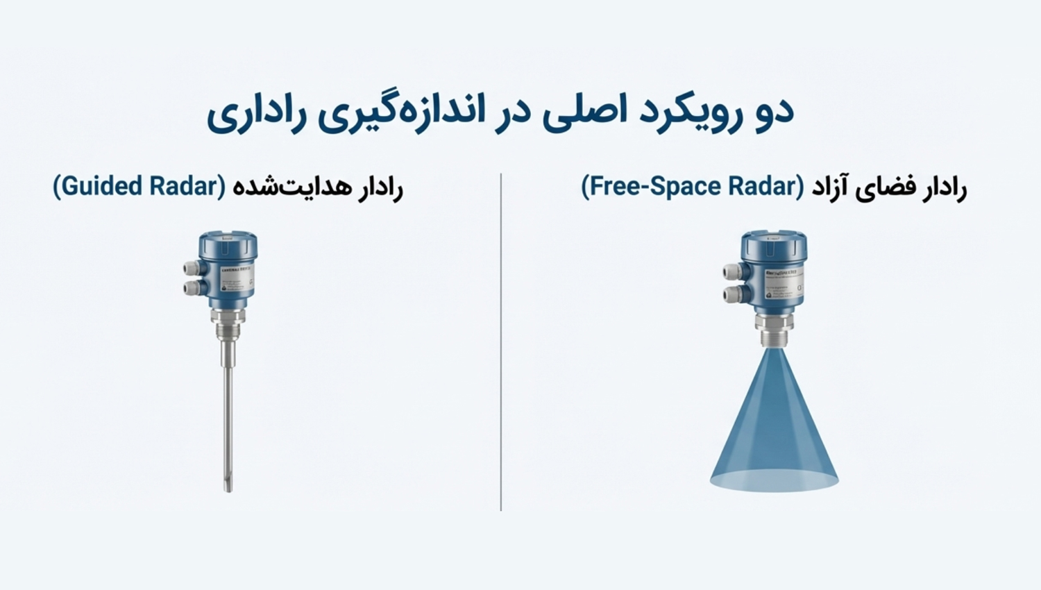 مفهوم مهم دوم، تفاوت بین رادار فضای آزاد (Free Space Radar) و رادار هدایتشده یا موجهدایتشونده (Guided Wave Radar) است. در رادارهای فضای آزاد، امواج از طریق آنتن به داخل مخزن تابیده میشوند و پس از برخورد با سطح سیال بازمیگردند. این نوع رادار برای اغلب مخازن استاندارد بسیار مناسب است. در مقابل، در رادارهای هدایتشده، موج راداری روی یک کابل، سیم یا میله فلزی هدایت میشود و به سمت پایین حرکت میکند. این طراحی، رادار هدایتشده را به گزینهای ایدهآل برای شرایط سخت، مخازن باریک، وجود موانع داخلی یا سیالات با DK پایین تبدیل میکند.