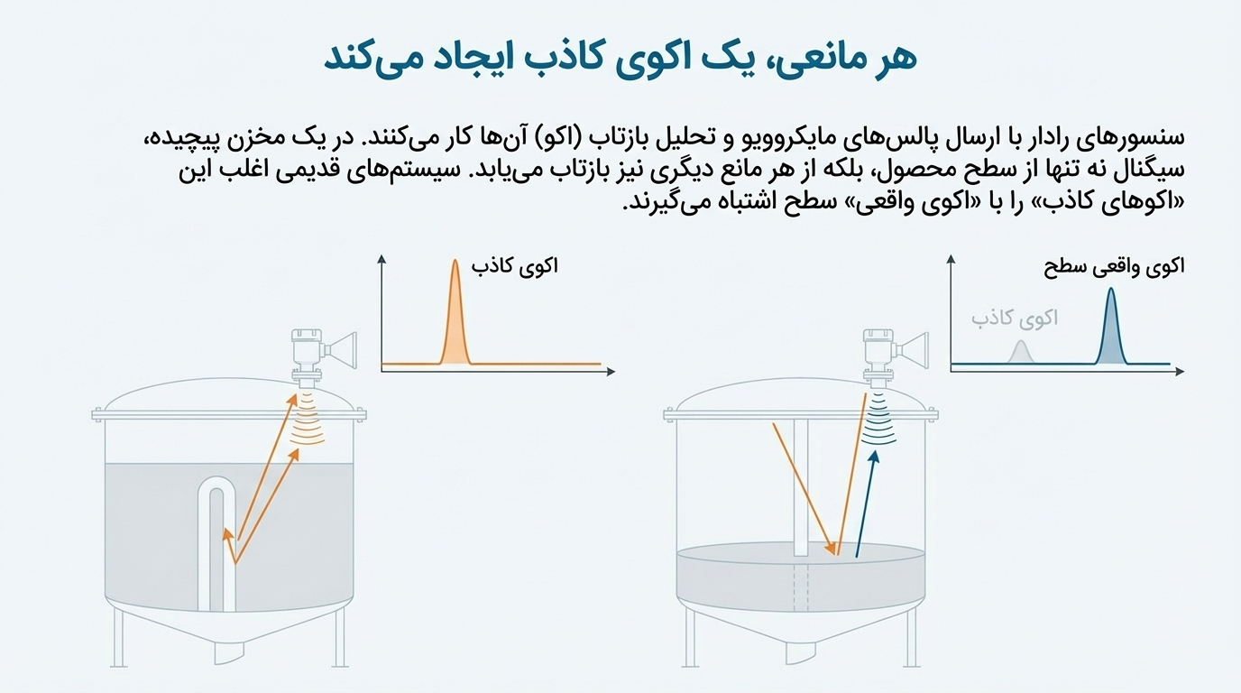 فناوری Multi-Echo Tracking که در نسلهای جدید تجهیزات راداری Endress+Hauser مانند خانوادههای Micropilot و Levelflex بهکار گرفته شده است، یک جهش اساسی در شیوه تحلیل سیگنالهای بازگشتی محسوب میشود. این فناوری صرفاً یک بهبود نرمافزاری ساده نیست، بلکه رویکرد اندازهگیری سطح را از «انتخاب یک پژواک غالب» به «تحلیل هوشمند و پیوسته کل میدان سیگنال» ارتقا میدهد. نتیجه این تحول، افزایش چشمگیر پایداری اندازهگیری، کاهش خطاهای مقطعی و بالا رفتن ایمنی فرآیند در مخازن پیچیده صنعتی است. در روشهای کلاسیک اندازهگیری سطح مبتنی بر Time of Flight (ToF)، رادار یک پالس ارسال میکند و پژواک بازگشتی از سطح محصول را بهعنوان مبنای محاسبه سطح در نظر میگیرد. چالش اصلی اینجاست که در مخازن واقعی، سطح تنها منبع بازتاب نیست. وجود تجهیزاتی مانند نازلها، لولههای داخلی، کویلهای گرمایشی، همزنها یا سازههای مکانیکی، باعث ایجاد پژواکهایی میشود که به آنها پژواک کاذب گفته میشود. برای مقابله با این مسئله، در روشهای سنتی از قابلیتی به نام Mapping یا نگاشت مخزن استفاده میشود که در آن، یک منحنی سرکوب تعریف شده و سیگنالهای مربوط به موانع ثابت از تحلیل نهایی حذف میگردند.