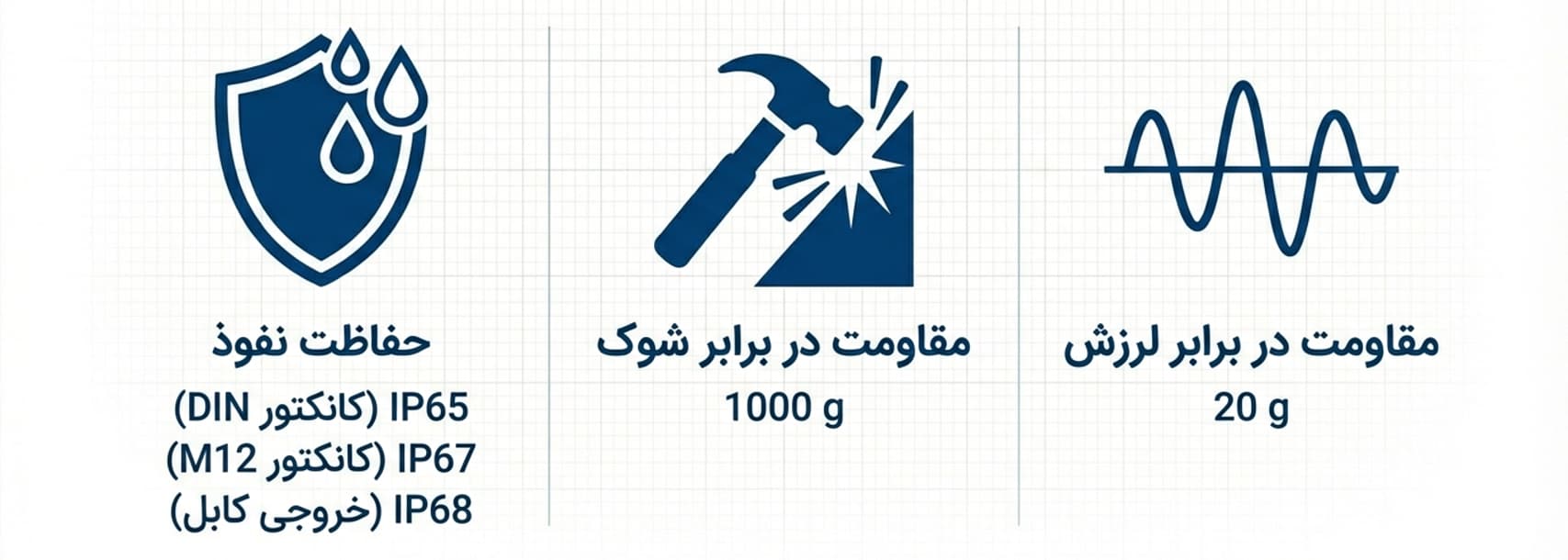 از نظر شرایط محیطی، درجه حفاظت بسته به نوع کانکتور بین IP65 تا IP68 متغیر است و مدلهای کابلی IP68 برای محیطهای مرطوب یا در معرض شستوشوی مداوم بسیار مناسب هستند. تحمل لرزش و شوک مکانیکی مطابق استانداردهای صنعتی تعریف شده و امکان استفاده در ماشینآلات با ارتعاش بالا را فراهم میکند. دمای محیط کاری -20 تا +80 درجه سانتیگراد و دمای سیال در مدل استاندارد تا +100 درجه (و در نسخه دارای المنت خنککننده تا +150 درجه سانتیگراد) قابل تحمل است که این ویژگی آن را برای خطوط فرآیندی با دمای بالا نیز مناسب میسازد. در بخش اتصالات فرآیندی، رزوههای فلاش G 1/2 B و G 1 B و نسخه بهداشتی سازگار با استاندارد 3-A Sanitary Standards ارائه میشود. متریالهای آببندی متنوع شامل NBR، FKM، EPDM و FFKM امکان تطبیق با سیالات و دماهای مختلف را فراهم میکنند. زبری سطح پایین بخشهای در تماس با سیال نیز به بهداشت و جلوگیری از تجمع مواد کمک میکند.